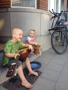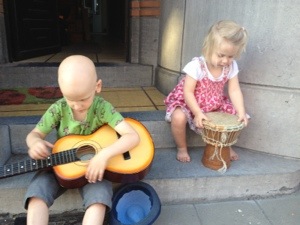Een collega van papa kwam een oude kindergitaar brengen voor Lucas. Hij installeerde zich meteen in het portaal aan de voordeur met zijn gitaar en zijn hoed. Ruth wilde natuurlijk meedoen en zorgde voor een bijzonder levendige beat. Buit van de dag: elk een halve euro, maar vooral heel veel plezier!