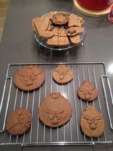 Morgen naar school betekent voor Lucas vandaag laatste dag thuisonderwijs. En dat mocht wel gevierd worden. Gisteren maakten tante Isabel en Lucas samen het speculoosdeeg, en vandaag werden de speculoosjes afgebakken. Het is duidelijk dat in de afgelopen 3 maand niet alleen Lucas veel van tante Isabel geleerd heeft, maar ook omgekeerd, tante Isabel van Lucas. Zoals tegen iedereen vertelt Lucas voortdurend honderduit over de wondere wereld van Angry Birds. Tante Isabel laat met deze speculoosjes zien dat ze heel goed geluisterd heeft. Zelfs het ruimteschip uit Angry Birds-Star Wars kon niet ontbreken.