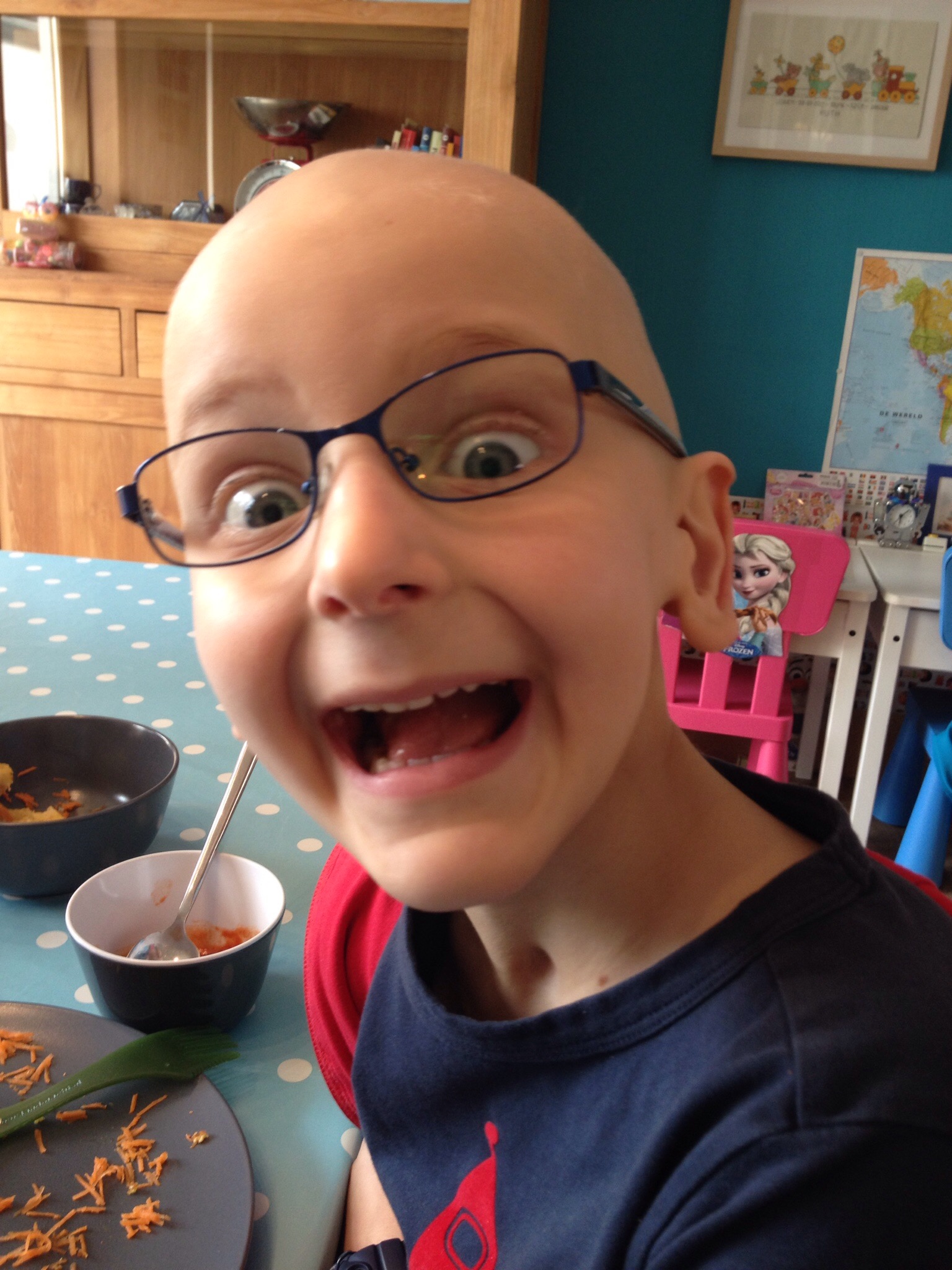 Helaas is mijn haar niet bijster dik en valt het erg uit vanaf een bepaalde lengte. Lucas zag me deze ochtend in de badkamer grote plukken haar uit het doucheputje halen en nadien ook nog uit mijn haarborstel. “Oei, jij verliest je haren, mama” zei hij bezorgd. “Hoe komt dat?” Ik legde uit dat mijn haar niet echt geschikt is om lang te worden. Hij zweeg even en zei toen beslist “Mama, ga jij maar snel naar de kapper. Je hoeft je haar niet meer te laten groeien voor een pruik, want het valt allemaal uit. Straks ben je zelf kaal en heb je zelf een pruik nodig, hahahaha!” Zo gezegd, zo gedaan. Mama ging deze namiddag met veel plezier een kort kopje halen bij de kapper.