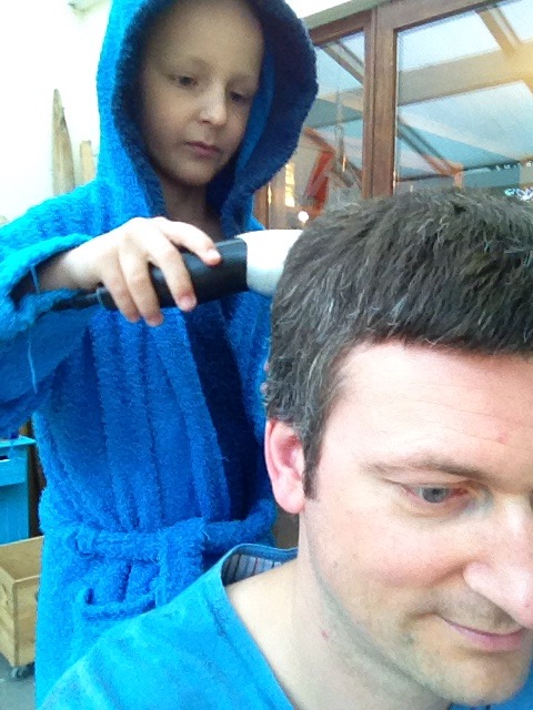 Een haarknipbeurt voor grote broer, inspireerde Lucas gisteravond om kappertje te spelen. Het was reeds bedtijd, dus beloofden we dat hij zich deze morgen nog eens op het haar van papa mocht uitleven. Stiekem hoopten we natuurlijk dat na het slapen de goesting zou over zijn. Helaas, een hyperactieve en dolenthousiaste Lucas trok een half slapende papa deze ochtend kordaat uit bed. En alsof dat nog niet genoeg was, lag beneden het haarknipmateriaal reeds gebruiksklaar uitgestald. Zelfs het ontbijt moest worden uitgesteld. Een heel vreemd begin van de dag: een ochtendlijke knipbeurt op de nuchtere maag buiten op het terras.