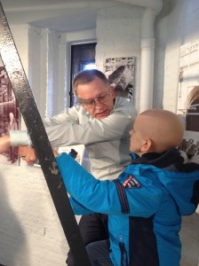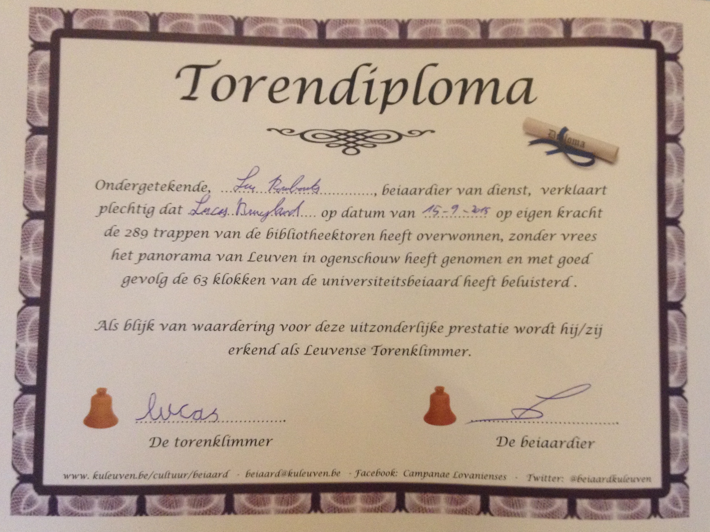 Stipt om 17u15 kwamen papa en Lucas aan bij de ingang van de Universiteitsbibliotheek. Mama’s grote baas Hilde stond reeds klaar, en gelukkig maar, want Lucas was super-zenuwachtig. Eindelijk de grote dag van de  beklimming van de bibliotheektoren. Vol goede moed begonnen we aan de klim van 289 trappen. Onderweg sloot Luc Rombouts, universiteits-beiaardier van Leuven, zich bij ons aan. Lucas luisterde geboeid naar de deskundige uitleg van Hilde bij elke verdieping in de toren. De dramatische branden van de Universiteitsbibliotheek tijdens de twee wereldoorlogen blijven hem intrigeren.