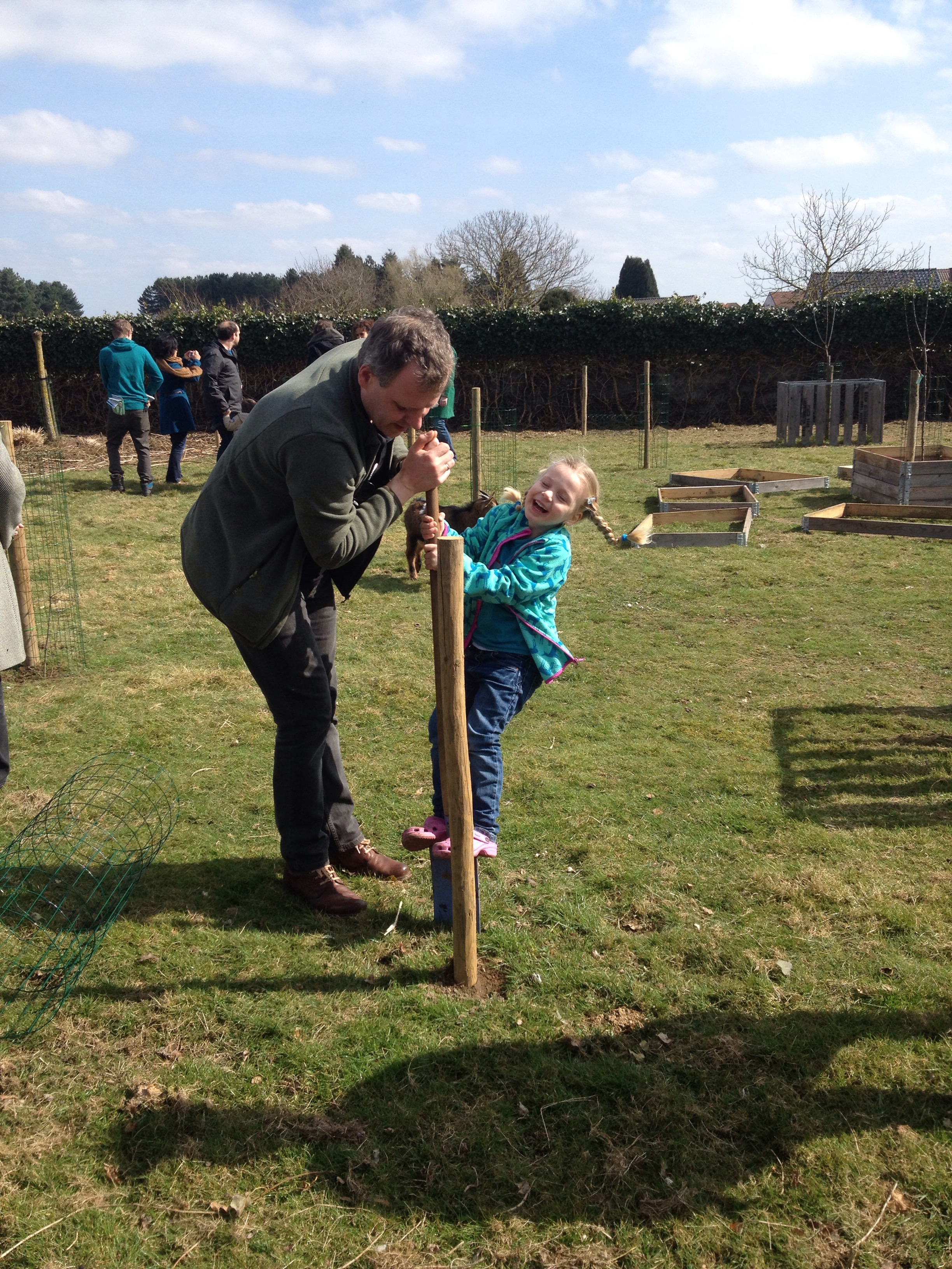Het begon als een half-serieuze opmerking over de noodzaak het groot aantal steunkaartjes dat we kregen, te compenseren met een nieuw bos. Tante Marijke nam het voortouw en organiseerde voor vandaag een heuse bos-aanplant-dag. Samen met een grote groep enthousiaste juffen èn directeur Jan, werden we zeer feestelijk onthaald met een ingetogen toast op Lucas en een uitgebreide feestelijke lunch. Het werd een heel gezellig en zelfs uitgelaten middag. De zon en de kindjes lokten ons al snel naar buiten en het boompjes planten kon eindelijk beginnen.